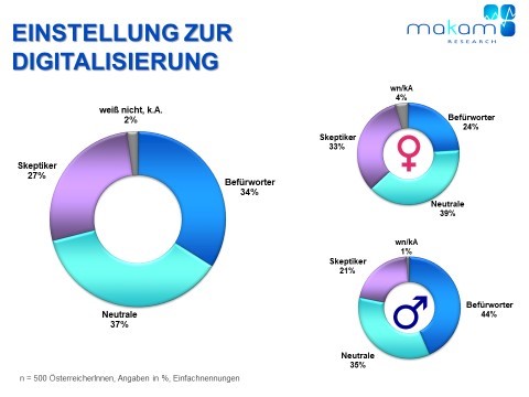 Die Einstellung der ÖsterreicherInnen zur zunehmenden Digitalisierung teilt die Bevölkerung in 3 gleich große Lager: Befürworter, Skeptiker und Neutrale.